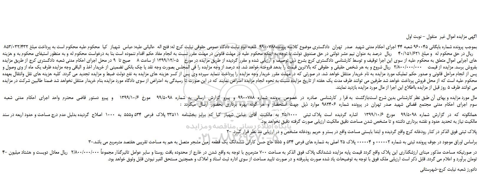 بموجب پرونده شماره بایگانی 960045 شعبه 44 اجرای احکام مدنی شهید صدر تهران دادگستری موضوع کلاسه پرونده9900788 شعبه دوم نیابت دادگاه عمومی حقوقی نیابت کرج له: فتح اله عالیانی علیه: عباس شهباز کیا محکوم علیه محکوم است به پرداخت مبلغ 853/032/432 ریال در حق محکوم له و مبلغ 40/151/621 ریال درصد به عنوان نیم عشر دولتی در حق صندوق دولت. با توجه به اینکه محکوم علیه در مهلت قانونی در مهلت مقرر نسبت به انجام مفاد حکم اقدام ننموده است بنا به درخواست محکوم له و به منظور استیفای محکوم به و هزینه های اجرایی اموال متعلق به محکوم علیه از سوی این اجرا توقیف و توسط کارشناسی دادگستری کرج بشرح ذیل توصیف و ارزیابی شده و مقرر گردیده از طریق مزایده در مورخ 1399/12/05 از ساعت 8 صبح تا 9 در محل اجرای احکام مدنی شعبه دادگستری کرج از طریق مزایده بفروش برسد. مزایده از قیمت 2/800/000/000 ریال شروع و به هر شخص حقیقی و حقوقی که بالاترین قیمت را بدهد فروخته خواهد شد. ده درصد از وجه مزایده را فی المجلس بصورت وجه نقد یا چک بانکی تضمینی از خریدار اخذ و الباقی وجه مزایده ظرف یک ماه از وی وصول و پس از انجام مراحل قانونی و صدور حکم تملیک مورد مزایده به نام خریدار منتقل خواهد شد. در صورتی که در مهلت مقرر خریدار وجه مزایده را پرداخت ننماید سپرده وی پس از کسر هزینه های مزایده به نفع دولت ضبط و مزایده تجدید می گردد. کلیه هزینه های نقل وانتقال بعهده محکوم علیه است که از محل فروش پرداخت خواهد شد طرفین می توانند ظرف مدت یک هفته از تاریخ مزایده نسبت به نحوه انجام مزایده اعتراض نمایند که در این صورت تا رسیدگی به اعتراض از سوی دادگاه مورد مزایده بنام خریدار منتقل نخواهد شد ضمنا طالبین شرکت در مزایده می توانند ظرف 5 روز قبل از مزایده بااطلاع این اجرا از مال مورد مزایده بازدید نمایند.