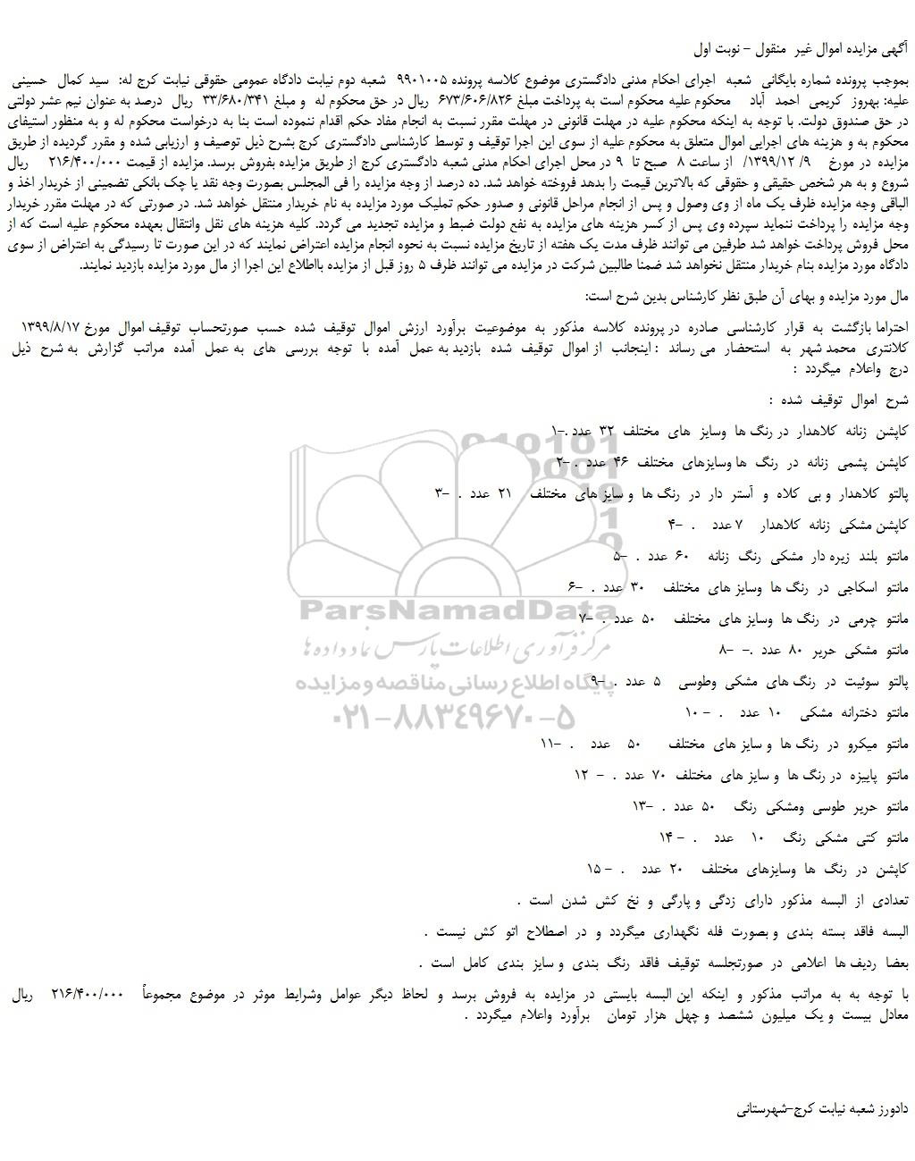 بموجب پرونده شماره بایگانی  شعبه  اجرای احکام مدنی دادگستری موضوع کلاسه پرونده 9901005  شعبه دوم نیابت دادگاه عمومی حقوقی نیابت کرج له:  سید کمال  حسینی  علیه: بهروز  کریمی  احمد  آباد    محکوم علیه محکوم است به پرداخت مبلغ 673/606/826  ریال در حق محکوم له  و مبلغ 33/680/341  ریال  درصد به عنوان نیم عشر دولتی در حق صندوق دولت. با توجه به اینکه محکوم علیه در مهلت قانونی در مهلت مقرر نسبت به انجام مفاد حکم اقدام ننموده است بنا به درخواست محکوم له و به منظور استیفای محکوم به و هزینه های اجرایی اموال متعلق به محکوم علیه از سوی این اجرا توقیف و توسط کارشناسی دادگستری کرج بشرح ذیل توصیف و ارزیابی شده و مقرر گردیده از طریق مزایده در مورخ    9/ 1399/12/  از ساعت 8  صبح تا  9 در محل اجرای احکام مدنی شعبه دادگستری کرج از طریق مزایده بفروش برسد. مزایده از قیمت 216/400/000    ریال شروع و به هر شخص حقیقی و حقوقی که بالاترین قیمت را بدهد فروخته خواهد شد. ده درصد از وجه مزایده را فی المجلس بصورت وجه نقد یا چک بانکی تضمینی از خریدار اخذ و الباقی وجه مزایده ظرف یک ماه از وی وصول و پس از انجام مراحل قانونی و صدور حکم تملیک مورد مزایده به نام خریدار منتقل خواهد شد. در صورتی که در مهلت مقرر خریدار وجه مزایده را پرداخت ننماید سپرده وی پس از کسر هزینه های مزایده به نفع دولت ضبط و مزایده تجدید می گردد. کلیه هزینه های نقل وانتقال بعهده محکوم علیه است که از محل فروش پرداخت خواهد شد طرفین می توانند ظرف مدت یک هفته از تاریخ مزایده نسبت به نحوه انجام مزایده اعتراض نمایند که در این صورت تا رسیدگی به اعتراض از سوی دادگاه مورد مزایده بنام خریدار منتقل نخواهد شد ضمنا طالبین شرکت در مزایده می توانند ظرف 5 روز قبل از مزایده بااطلاع این اجرا از مال مورد مزایده بازدید نمایند.