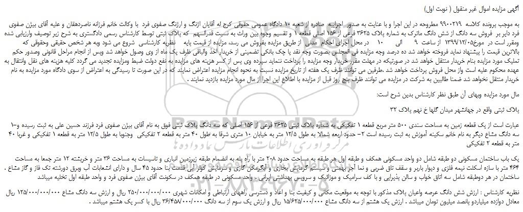 به موجب پرونده کلاسه 9900219 مطروحه در این اجرا و با عنایت به صدور اجراییه صادره از شعبه 10 دادگاه عمومی حقوقی کرج له آقایان اژنگ و ارژنگ صفوی فرد با وکالت خانم فرزانه ناصردهقان و علیه آقای بیژن صفوی فرد دایر بر فروش سه دانگ از شش دانگ ماترک به شماره پلاک 3625 فرعی از 156 اصلی قطعه 1 و تقسیم وجوه بین وراث به نسبت قدرالسهم که پلاک ثبتی توسط کارشناس رسمی دادگستری به شرح زیر توصیف وارزیابی شده ومقرر است در مورخ1399/12/05 از ساعت 9 الی 10 در محل اجرای احکام مدنی از طریق مزایده بفروش می رسد، مزایده از قیمت پایه نظریه کارشناسی شروع می شود وبه هر شخص حقیقی وحقوقی که بالاترین قیمت را پیشنهاد نماید فروخته خواهد شد ده درصد وجه مزایده فی المجلس بصورت وجه نقد یا چک بانکی تضمینی از خریدار اخذ والباقی ظرف یک ماه از وی وصول خواهد شد وپس از انجام مراحل قانونی وصدور حکم تملیک مورد مزایده بنام خریدار منتقل خواهد شد در صورتیکه در مهلت مقرر خریدار وجه مزایده را پرداخت ننماید سپرده وی پس از کسر هزینه های مزایده به نفع دولت ضبط ومزایده تجدید می گردد کلیه هزینه های نقل وانتقال به عهده محکوم علیه است واز محل فروش پرداخت خواهد شد .طرفین می توانند ظرف یک هفته از تاریخ مزایده نسبت به نحوه انجام مزایده اعتراض نمایند که در این صورت تا رسیدگی به اعتراض از سوی دادگاه مورد مزایده به نام خریدار منتقل نخواهد شد ضمنا طالبین به شرکت در مزایده می توانند ظرف پنج روز قبل از مزایده با اطلاع این اجرا از مال مورد مزایده بازدید نمایند .