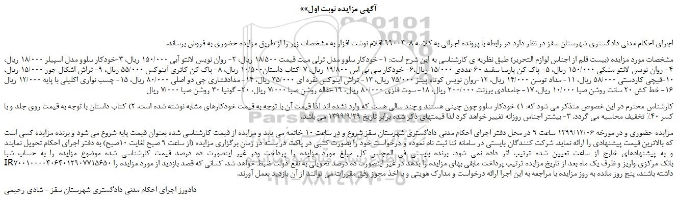 اجرای احکام مدنی دادگستری شهرستان سقز در نظر دارد در رابطه با پرونده اجرائی به کلاسه 9900408 اقلام نوشت افزار به مشخصات زیر را از طریق مزایده حضوری به فروش برساند.
