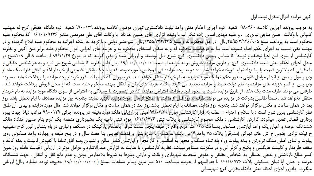 به موجب پرونده اجرایی کلاسه 980460  شعبه  دوم اجرای احکام مدنی واحد نیابت دادگستری تهران موضوع کلاسه پرونده 9900129 شعبه  دوم دادگاه حقوقی کرج له .مهشید کمپانی با وکالت  حسن متاجی نیموری  . و علیه مهدی اسمی زاده شکر اب با وثیقه گزاری اقای حسین خداداد  با وکالت اقای علی معرمعلی مغانلو 1610109236  که محکوم علیه محکوم است به پرداخت مبلغ 25/562/146/905ریال  در حق محکوم له و مبلغ 1255/732/345ریال  نیم عشر دولتی ، با توجه به اینکه اجرائیه به محکوم علیه ابلاغ گردیده و در مهلت مقرر نسبت به اجرای حکم اقدام ننموده است بنا به درخواست محکوم له و به منظور استیفای محکوم به و هزینه های اجرایی اموال محکوم علیه برابر متن آگهی و نظریه کارشناسی از سوی این اجرا توقیف و توسط کارشناس رسمی دادگستری کرج بشرح ذیل توصیف و ارزیابی شده و مقرر گردید که در مورخ 99/11/29 از ساعت 8 الی 109صبح در محل اجرای احکام مدنی شعبه دادگستری کرج از طریق مزایده بفروش برسد مزایده از قیمت 19/000/000/000 ریال طبق نظریه کارشناسی شروع می شود و به هر شخص حقیقی و یا حقوقی که بالاترین قیمت را پیشنهاد نماید فروخته خواهد شد . ده درصد وجه مزایده فی المجلس بصورت وجه نقد و یا چک بانکی تضمینی از خریدار اخذ و الباقی ظرف یک ماه از وی وصول و پس از انجام مراحل قانونی صدور حکم تملیک مورد مزایده به نام خریدار منتقل خواهد شد . در صورتی که در مهلت مقرر خریدار وجه مزایده را پرداخت ننماید ، سپرده وی پس از کسر هزینه های مزایده به نفع دولت ضبط و مزایده تجدید می گردد ، کلیه هزینه های نقل و انتقال بعهده محکوم علیه است که از محل فروش پرداخت خواهد شد . طرفین می توانند ظرف مدت یک هفته از تاریخ مزایده نسبت به نحوه انجام مزایده اعتراض نمایند  که در اینصورت تا رسیدگی به اعتراض از سوی دادگاه مورد مزایده به نام خریدار منتقل نخواهد شد . ضمناً طالبین بشرکت در مزایده می توانند ظرف 5 روز قبل از مزایده با اطلاع از مال  مورد مزایده بازدید نمایند چنانجه روز مزایده مصادف با ایام تعطیل باشد روز بعد در همان ساعت و مکان برگزار خواهد شد. چنانچه روز مزایده مصادف با ایام تعطیل باشد روز بعد در همان ساعت و مکان برگزار خواهد شد  مال مورد مزایده و بهای آن طبق نظر کارشناسی بدین شرح است : با سلام و احترام ؛ عطف به قرار کارشناسی مورخ 99/02/20 مبنی بر ارزیابی ملک مورد وثیقه در پرونده اجرائی 9900129 مراتب ذیلا جهت بهره برداری قضائی تقدیم میگردد. گزارش کارشناسی : ملک موضوع کارشناسی با پلاک ثبتی 161/16776 حوزه ثبتی ناحیه یک وشهرداری منطقه یک کرج بنام حسین خداداد مالک ششدانگ عرصه و اعیان یک واحد آپارتمان مسکونی بمساحت 165 متر مربع واقع در طبقه پنجم سمت شرقی بانضمام پارکینگ در همکف وانباری در بام بنشانی البرز کرج عظیمیه خ نیک نژادی جنوبی خ ش حاتم تهرانی (مشرقی) پلاک 75 واحد 14می باشد. ساختمان با سازه بتنی و قدمت تقریبی بنا هفت سال و در پنج طبقه و چهارده واحد مسکونی روی پیلوت و نمای اصلی سنگ تراورتن و بدنه پیلوت وراه پله تمام سنگ و مجهز به آسانسور و گاز مجزا و اپارتمان شامل سالن و نشیمن وسه اتاق تماما با کفپوش لمینت و بدنه کاغذ و سقف طرحدار و کابینت هایگلس و پکیج و کولر آبی و در سکونت مستاجر میباشد. نظریه کارشناسی: با عنایت به گزارش صدرالاشاره و عوامل موثر در ارزیابی ؛ قیمت عادله روز بدون کسر مبالغ بازداشتی و بدهی احتمالی به اشخاص حقیقی و حقوقی منجمله شهرداری و بانک و دارائی ومنوط به شروط بلامعارض بودن و عدم مانع نقل و انتقال ، جهت ششدانگ عرصه و اعیان اپارتمان مسکونی پلاک 161/16776 با قدرالسهم از عرصه بمساحت 510 متر مربع وسایر مشاعات بمبلغ ( 19/000/000/000 بحروف نوزده میلیارد ریال) ارزیابی میگردد.  دادورز اجرای احکام مدنی دادگاه حقوقی کرج شهرستانی