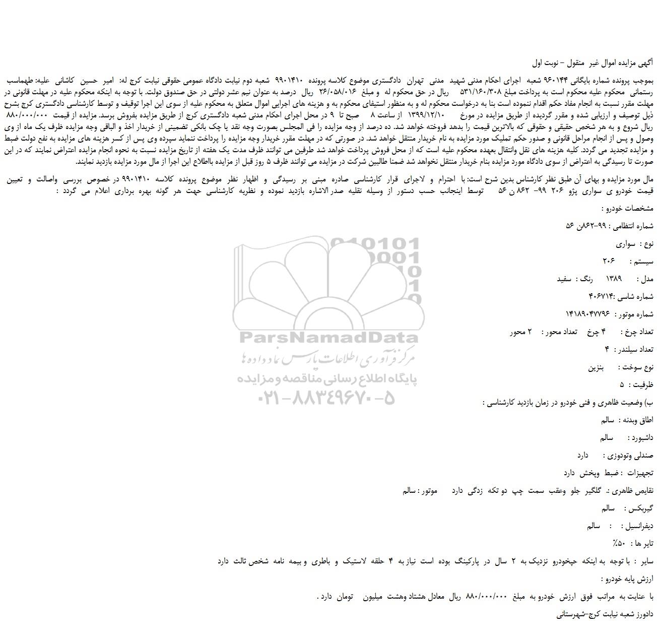 مال مورد مزایده و بهای آن طبق نظر کارشناس بدین شرح است: با  احترام  و  لاجرای  قرار  کارشناسی  صادره  مبنی  بر  رسیدگی  و  اظهار  نظر  موضوع  پرونده  کلاسه  9901410 در خصوص  بررسی  واصالت  و  تعیین  قیمت  خودرو ی  سواری  پژو  206  99-  862 ن 56      توسط  اینجانب  حسب  دستور  از  وسیله  نقلیه  صدر الاشاره  بازدید  نموده  و  نظریه  کارشناسی  حهت  هر  گونه  بهره  برداری  اعلام  می  گردد  :
