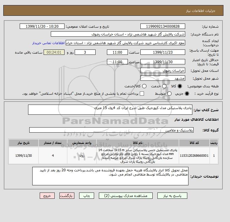 نام دستگاه خریدار:شرکت پالایش گاز شهید هاشمی نژاد - استان خراسان رضوی
