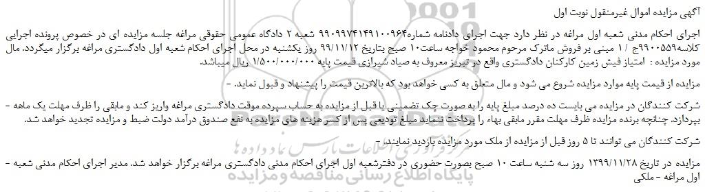 اجرای احکام مدنی شعبه اول مراغه در نظر دارد جهت اجرای دادنامه شماره9909974149100964 شعبه 2 دادگاه عمومی حقوقی مراغه جلسه مزایده ای در خصوص پرونده اجرایی کلاسه9900559ج / 1 مبنی بر فروش ماترک مرحوم محمود خواجه ساعت10 صبح بتاریخ 99/11/12 روز یکشنبه در محل اجرای احکام شعبه اول دادگستری مراغه برگزار میگردد. مال مورد مزایده : امتیاز فیش زمین کارکنان دادگستری واقع در تبریز معروف به صیاد شیرازی قیمت پایه 1/500/000/000 ریال میباشد.