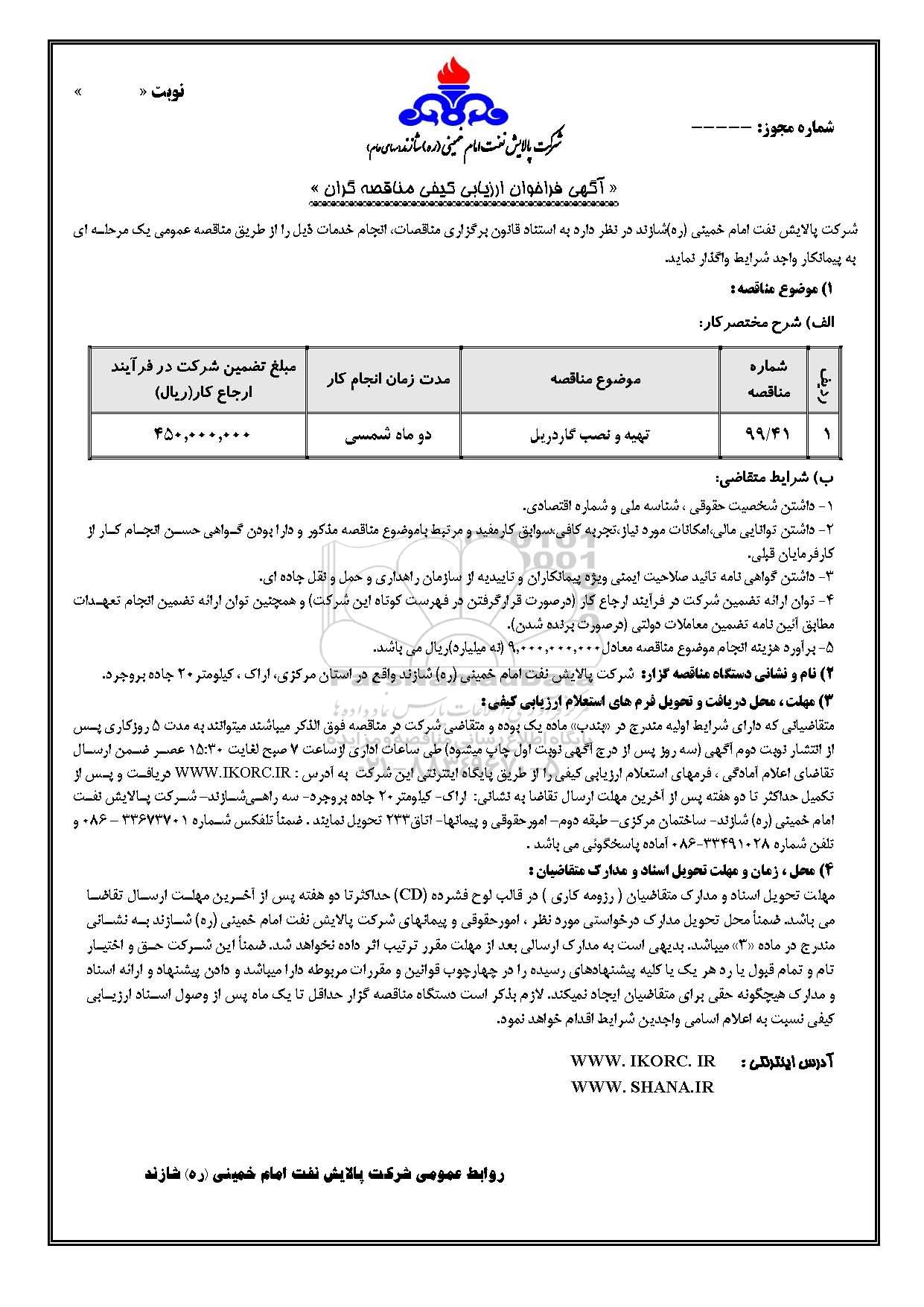 متقاضیانی که دارای شرایط اولیه بند ب بوده و آمادگی لازم جهت انجام مناقصه مذکور را دارند می توانند پس از انتشار آگهی نوبت دوم (3 روز پس از انتشار آگهی نوبت اول) به مدت 5 روز کاری ضمن ارسال تقاضای شرکت در مناقصه را از طریق نمابر 33672013-086 و 61623660-021 فرمهای استعلام ارزیابی کیفی را از پایگاه اینترنتی این شرکت به آدرس WWW.IKORC.IR دریافت و بر اساس آن مدارک لازمه را تکمیل و صرفا بر روی لوح فشرده CD به این شرکت ارسال نمایند.
