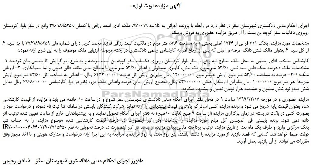 اجرای احکام مدنی دادگستری شهرستان سقز در نظر دارد در رابطه با پرونده اجرائی به کلاسه 970019، ملک آقای اسعد رزاقی با کدملی 3761895259 واقع در سقز بلوار کردستان روبروی دخانیات سقز کوچه بن بست را از طریق مزایده حضوری به فروش برساند.
