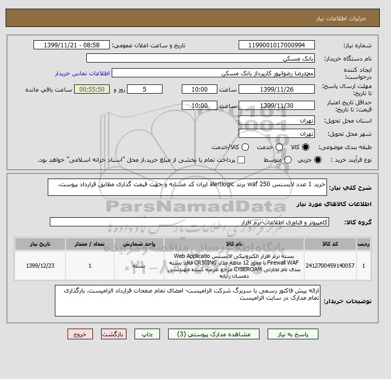 شرح کلی نیاز: خرید 1 عدد لایسنس waf 250 برند alertlogic ایران کد مشابه و جهت قیمت گذاری مطابق قرارداد پیوست.