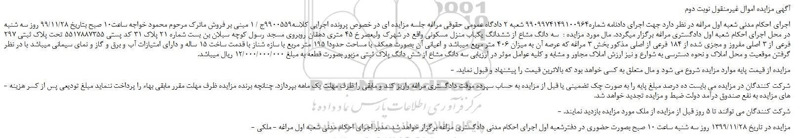 اجرای احکام مدنی شعبه اول مراغه در نظر دارد جهت اجرای دادنامه شماره9909974149100964 شعبه 2 دادگاه عمومی حقوقی مراغه جلسه مزایده ای در خصوص پرونده اجرایی کلاسه9900559ج / 1 مبنی بر فروش ماترک مرحوم محمود خواجه ساعت10 صبح بتاریخ 99/11/28 روز سه شنبه در محل اجرای احکام شعبه اول دادگستری مراغه برگزار میگردد. مال مورد مزایده : سه دانگ مشاع از ششدانگ یکباب منزل مسکونی واقع در شهرک ولیعصر خ 45 متری دهقان روبروی مسجد رسول کوچه سبلان بن بست شماره 21 پلاک 31 کد پستی 5517887355 تحت پلاک ثبتی 297 فرعی از 3 اصلی مفروز و مجزی شده از 184 فرعی از اصلی مذکور بخش 3 مراغه که عرصه آن به میزان 406 متر مربع میباشد و اعیانی آن بصورت همکف با مساحت حدودا 195 متر مربع با سازه شناز با قدمت ساخت 15 ساله و دارای امتیازات آب و برق و گاز و نمای سیمانی میباشد با در نظر گرفتن موقعیت و محل املاک و نحوه دسترسی به شوارع و نیز ارزش املاک مجاور و مشابه و کلیه عوامل موثر در ارزیابی سه دانگ مشاع از شش دانگ پلاک ثبتی مزبور بصورت قطعه به مبلغ 12/000/000/000 ریال میباشد.