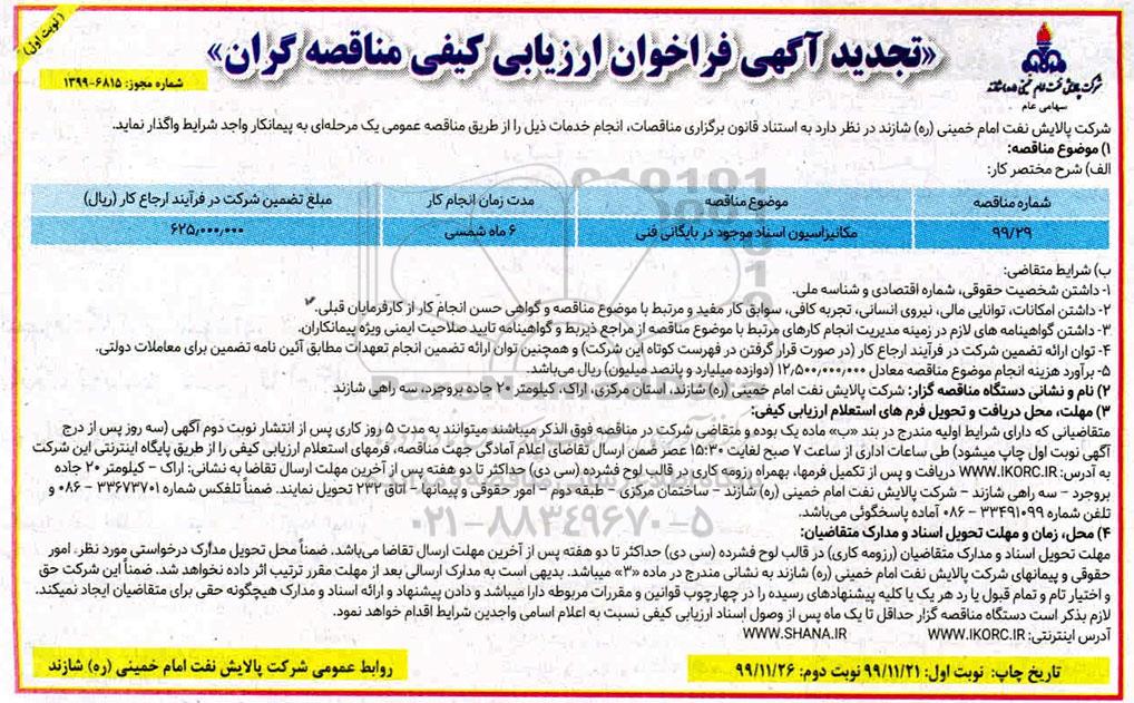 تجدید فراخوان ارزیابی کیفی مکانیزاسیون اسناد موجود در بایگانی فنی از کلیه افراد متخصص و شرکتها واجد شرایط دعوت به عمل میآید در مناقصه با کد خبرگزاری پارس نماد: 3162088 شرکت نمایند.