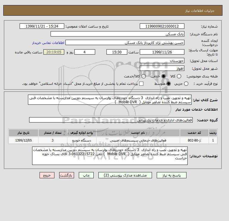 توضیحات خریدار:تهیه و تجهیز، نصب و راه اندازی 3 دستگاه خودروهای پولرسان به سیستم دوربین مداربسته با مشخصات فنی سیستم ضبط کننده تصاویر موبایل ( Mobile DVR ) تلفن 06132215722-3 آقای بساک حوزه حراست