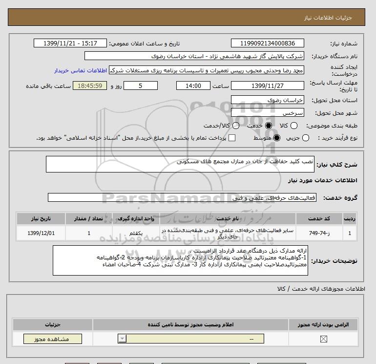 نام دستگاه خریدار:شرکت پالایش گاز شهید هاشمی نژاد - استان خراسان رضوی