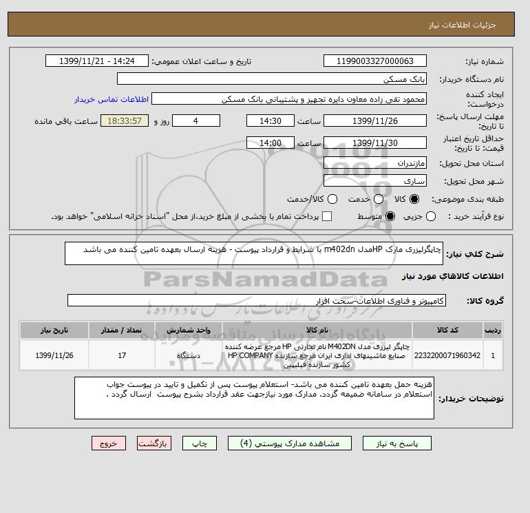 شرح کلی نیاز: چاپگرلیزری مارک HPمدل m402dn با شرایط و قرارداد پیوست - هزینه ارسال بعهده تامین کننده می باشد