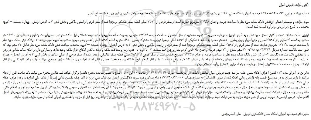 شماره پرونده اجرایی: کلاسه 9900893 شعبه دوم اجرای احکام مدنی دادگستری شهرستان اردبیل در راستای دستور فروش ملک مشاع خانه مخروبه ،خواهان کریم بیدارپرچین،خوانده:صالح آردن
