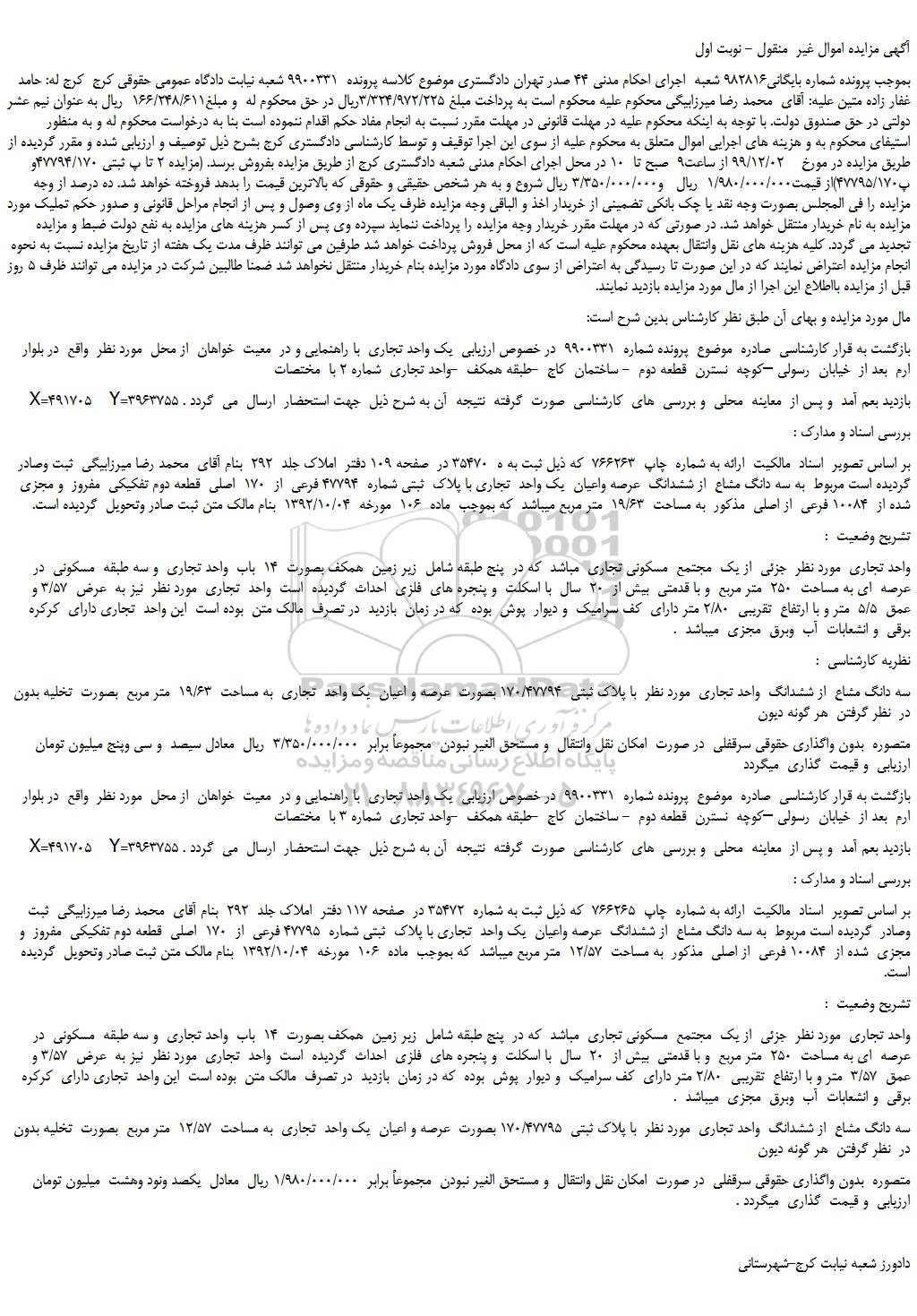 بموجب پرونده شماره بایگانی982816 شعبه اجرای احکام مدنی 44 صدر تهران دادگستری موضوع کلاسه پرونده 9900331 شعبه نیابت دادگاه عمومی حقوقی کرج کرج له: حامد غفار زاده متین علیه: آقای محمد رضا میرزابیگی محکوم علیه محکوم است به پرداخت مبلغ 3/324/972/225ریال در حق محکوم له و مبلغ166/248/611 ریال به عنوان نیم عشر دولتی در حق صندوق دولت. با توجه به اینکه محکوم علیه در مهلت قانونی در مهلت مقرر نسبت به انجام مفاد حکم اقدام ننموده است بنا به درخواست محکوم له و به منظور استیفای محکوم به و هزینه های اجرایی اموال متعلق به محکوم علیه از سوی این اجرا توقیف و توسط کارشناسی دادگستری کرج بشرح ذیل توصیف و ارزیابی شده و مقرر گردیده از طریق مزایده در مورخ 99/12/02 از ساعت9 صبح تا 10 در محل اجرای احکام مدنی شعبه دادگستری کرج از طریق مزایده بفروش برسد. (مزایده 2 تا پ ثبتی 47794/170و پ47795/170)از قیمت1/980/000/000 ریال و3/350/000/000 ریال شروع و به هر شخص حقیقی و حقوقی که بالاترین قیمت را بدهد فروخته خواهد شد. ده درصد از وجه مزایده را فی المجلس بصورت وجه نقد یا چک بانکی تضمینی از خریدار اخذ و الباقی وجه مزایده ظرف یک ماه از وی وصول و پس از انجام مراحل قانونی و صدور حکم تملیک مورد مزایده به نام خریدار منتقل خواهد شد. در صورتی که در مهلت مقرر خریدار وجه مزایده را پرداخت ننماید سپرده وی پس از کسر هزینه های مزایده به نفع دولت ضبط و مزایده تجدید می گردد. کلیه هزینه های نقل وانتقال بعهده محکوم علیه است که از محل فروش پرداخت خواهد شد طرفین می توانند ظرف مدت یک هفته از تاریخ مزایده نسبت به نحوه انجام مزایده اعتراض نمایند که در این صورت تا رسیدگی به اعتراض از سوی دادگاه مورد مزایده بنام خریدار منتقل نخواهد شد ضمنا طالبین شرکت در مزایده می توانند ظرف 5 روز قبل از مزایده بااطلاع این اجرا از مال مورد مزایده بازدید نمایند.