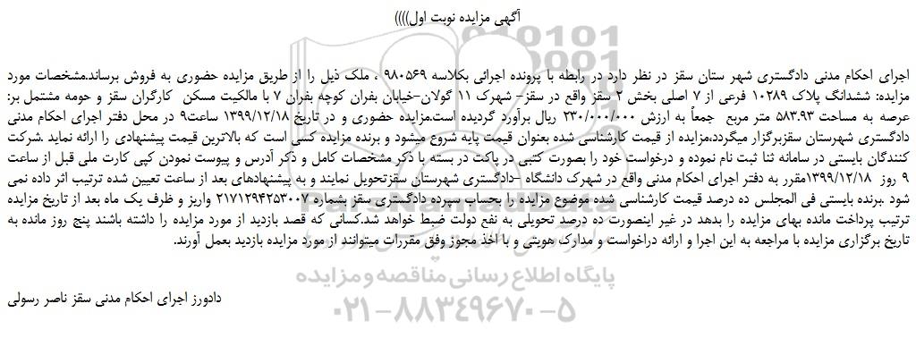 اجرای احکام مدنی دادگستری شهر ستان سقز در نظر دارد در رابطه با پرونده اجرائی بکلاسه 980569 ، ملک ذیل را از طریق مزایده حضوری به فروش برساند.مشخصات مورد مزایده: ششدانگ پلاک 10289 فرعی از 7 اصلی بخش 2 سقز واقع در سقز- شهرک 11 گولان-خیابان بفران کوچه بفران 7 با مالکیت مسکن کارگران سقز و حومه مشتمل بر: عرصه به مساحت 583.93 متر مربع جمعاً به ارزش 230/000/000 ریال برآورد گردیده است.مزایده حضوری و در تاریخ 1399/12/18 ساعت9 در محل دفتر اجرای احکام مدنی دادگستری شهرستان سقزبرگزار میگردد،مزایده از قیمت کارشناسی شده بعنوان قیمت پایه شروع میشود و برنده مزایده کسی است که بالاترین قیمت پیشنهادی را ارائه نماید .شرکت کنندگان بایستی در سامانه ثنا ثبت نام نموده و درخواست خود را بصورت کتبی در پاکت در بسته با ذکر مشخصات کامل و ذکر آدرس و پیوست نمودن کپی کارت ملی قبل از ساعت 9 روز 1399/12/18مقرر به دفتر اجرای احکام مدنی واقع در شهرک دانشگاه -دادگستری شهرستان سقزتحویل نمایند و به پیشنهادهای بعد از ساعت تعیین شده ترتیب اثر داده نمی شود .برنده بایستی فی المجلس ده درصد قیمت کارشناسی شده موضوع مزایده را بحساب سپرده دادگستری سقز بشماره 2171294253007 واریز و ظرف یک ماه بعد از تاریخ مزایده ترتیب پرداخت مانده بهای مزایده را بدهد در غیر اینصورت ده درصد تحویلی به نفع دولت ضبط خواهد شد.کسانی که قصد بازدید از مورد مزایده را داشته باشند پنج روز مانده به تاریخ برگزاری مزایده با مراجعه به این اجرا و ارائه دراخواست و مدارک هویتی و با اخذ مجوز وفق مقررات میتوانند از مورد مزایده بازدید بعمل آورند.