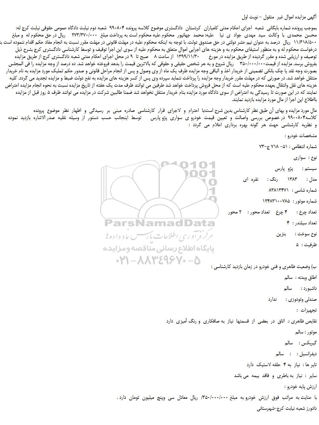 مال مورد مزایده و بهای آن طبق نظر کارشناس بدین شرح است:با احترام و لاجرای قرار کارشناسی صادره مبنی بر رسیدگی و اظهار نظر موضوع پرونده کلاسه9900804 در خصوص بررسی واصالت و تعیین قیمت خودرو ی سواری پژو پارس توسط اینجانب حسب دستور از وسیله نقلیه صدر الاشاره بازدید نموده و نظریه کارشناسی حهت هر گونه بهره برداری اعلام می گردد :