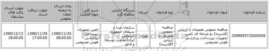 | 2099093733000009 | مناقصه عمومی همزمان با ارزیابی (فشرده) دو مرحله ای تامین تجهیزات زیرساخت پردازشی هوش مصنوعی | مناقصه عمومی همزمان با ارزیابی (فشرده) | تهران | سازمان صدا و سیمای جمهوری اسلامی ایران(معاونت توسعه و فناور | تامین تجهیزات زیرساخت پردازشی هوش مصنوعی | 1399/11/25 08:00:00 | 1399/11/29 17:00:00 | 1399/12/13 18:00:00 |