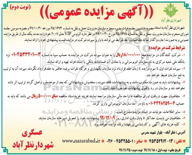 شهرداری نظرآباد اتوبوس VIP مدل 2007 خود را به مدت یک سال از طریق مزایده عمومی و به صورت اجاره واگذار نماید
