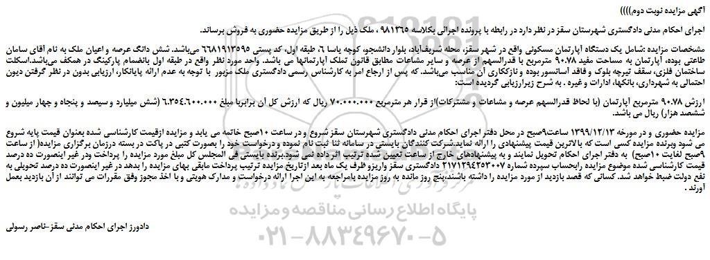 اجرای احکام مدنی دادگستری شهرستان سقز در نظر دارد در رابطه با پرونده اجرائی بکلاسه 981265 ، ملک ذیل را از طریق مزایده حضوری به فروش برساند.