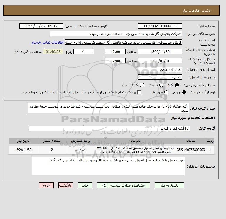 نام دستگاه خریدار:شرکت پالایش گاز شهید هاشمی نژاد - استان خراسان رضوی