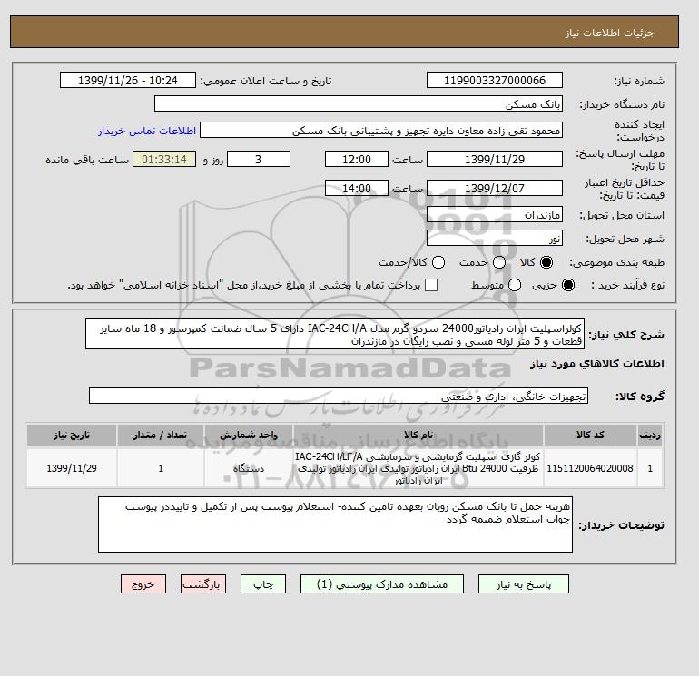 1 | 1151120064020008 | کولر گازی اسپلیت گرمایشی و سرمایشی IAC-24CH/LF/A ظرفیت 24000 Btu ایران رادیاتور تولیدی ایران رادیاتور تولیدی ایران رادیاتور | دستگاه | 1 | 1399/11/29 |