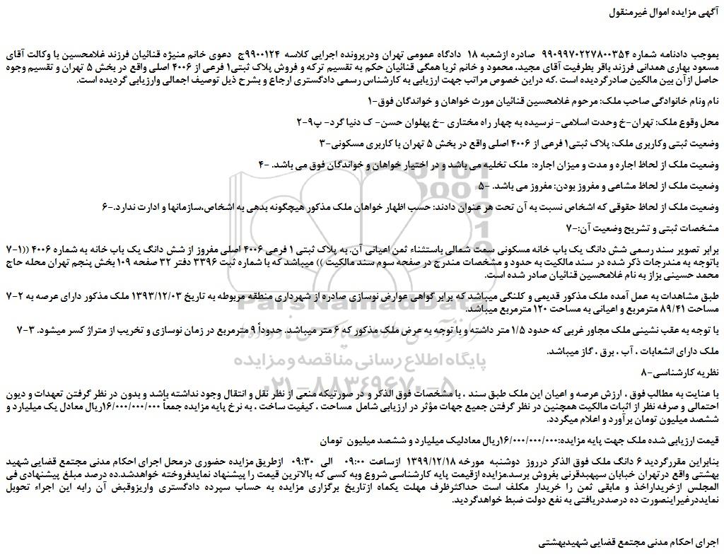 بموجب دادنامه شماره 9909970227800354  صادره ازشعبه 18  دادگاه عمومی تهران ودرپرونده اجرایی کلاسه  9900124ج  دعوی خانم منیژه قنائیان فرزند غلامحسین با وکالت آقای مسعود بهاری همدانی فرزند باقر بطرفیت آقای مجید، محمود و خانم ثریا همگی قنائیان حکم به تقسیم ترکه و فروش پلاک ثبتی1 فرعی از 4006 اصلی واقع در بخش 5 تهران و تقسیم وجوه حاصل ازآن بین مالکین صادرگردیده است .که دراین خصوص مراتب جهت ارزیابی به کارشناس رسمی دادگستری ارجاع و بشرح ذیل توصیف اجمالی وارزیابی گردیده است.