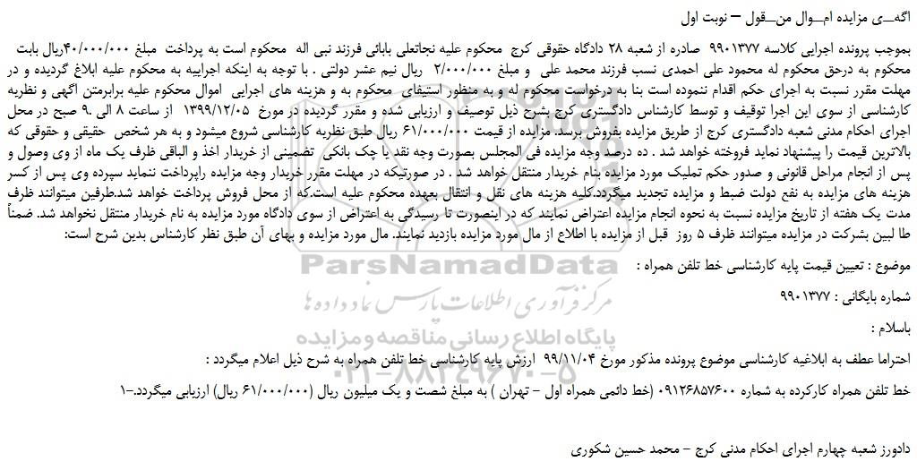 بموجب پرونده اجرایی کلاسه 9901377 صادره از شعبه 28 دادگاه حقوقی کرج محکوم علیه نجاتعلی بابائی فرزند نبی اله محکوم است به پرداخت مبلغ 40/000/000ریال بابت محکوم به درحق محکوم له محمود علی احمدی نسب فرزند محمد علی و مبلغ 2/000/000 ریال نیم عشر دولتی . با توجه به اینکه اجراییه به محکوم علیه ابلاغ گردیده و در مهلت مقرر نسبت به اجرای حکم اقدام ننموده است بنا به درخواست محکوم له و به منظور استیفای محکوم به و هزینه های اجرایی اموال محکوم علیه برابرمتن اگهی و نظریه کارشناسی از سوی این اجرا توقیف و توسط کارشناس دادگستری کرج بشرح ذیل توصیف و ارزیابی شده و مقرر گردیده در مورخ 1399/12/05 از ساعت 8 الی .9 صبح در محل اجرای احکام مدنی شعبه دادگستری کرج از طریق مزایده بفروش برسد. مزایده از قیمت 61/000/000 ریال طبق نظریه کارشناسی شروع میشود و به هر شخص حقیقی و حقوقی که بالاترین قیمت را پیشنهاد نماید فروخته خواهد شد . ده درصد وجه مزایده فی المجلس بصورت وجه نقد یا چک بانکی تضمینی از خریدار اخذ و الباقی ظرف یک ماه از وی وصول و پس از انجام مراحل قانونی و صدور حکم تملیک مورد مزایده بنام خریدار منتقل خواهد شد . در صورتیکه در مهلت مقرر خریدار وجه مزایده راپرداخت ننماید سپرده وی پس از کسر هزینه های مزایده به نفع دولت ضبط و مزایده تجدید میگردد.کلیه هزینه های نقل و انتقال بعهده محکوم علیه است.که از محل فروش پرداخت خواهد شد.طرفین میتوانند ظرف مدت یک هفته از تاریخ مزایده نسبت به نحوه انجام مزایده اعتراض نمایند که در اینصورت تا رسیدگی به اعتراض از سوی دادگاه مورد مزایده به نام خریدار منتقل نخواهد شد. ضمناً طا لبین بشرکت در مزایده میتوانند ظرف 5 روز قبل از مزایده با اطلاع از مال مورد مزایده بازدید نمایند. مال مورد مزایده و بهای آن طبق نظر کارشناس بدین شرح است: