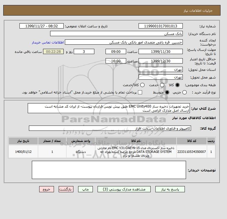 شرح کلی نیاز: خرید تجهیزات ذخیره ساز EMC Unity400 طبق پیش نویس قرارداد پیوست- از ایران کد مشابه است ارسال اصل مدارک الزامی است