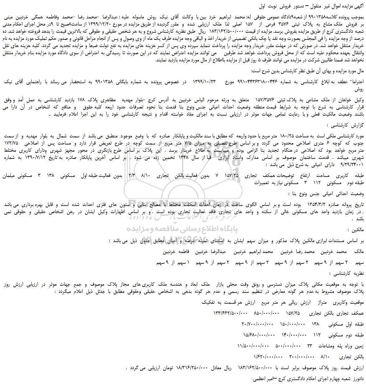 بموجب پرونده کلاسه9901358 از شعبه9دادگاه عمومی حقوقی له: محمد ابراهیم خرد بین با وکالت آقای نیک روش ماسوله علیه : عبدالرضا -محمد رضا -محمد وفاطمه همگی خردبین مبنی بر فروش ملک مشاع به پلاک ثبتی 3576 فرعی از 157 اصلی لذا ملک ارزیابی شده و مقرر گردیده از طریق مزایده در مورخ 1399/12/20 از ساعت8صبح تا 9در محل اجرای احکام مدنی شعبه دادگستری کرج از طریق مزایده بفروش برسد. مزایده از قیمت 183/162/500/000 ریال طبق نظریه کارشناس شروع و به هر شخص حقیقی و حقوقی که بالاترین قیمت را بدهد فروخته خواهد شد. ده درصد از وجه مزایده را فی المجلس بصورت وجه نقد یا چک بانکی تضمینی از خریدار اخذ و الباقی وجه مزایده ظرف یک ماه از وی وصول و پس از انجام مراحل قانونی و صدور حکم تملیک مورد مزایده به نام خریدار منتقل خواهد شد. در صورتی که در مهلت مقرر خریدار وجه مزایده را پرداخت ننماید سپرده وی پس از کسر هزینه های مزایده به نفع دولت ضبط و مزایده تجدید می گردد. کلیه هزینه های نقل وانتقال بعهده محکوم علیه است که از محل فروش پرداخت خواهد شد طرفین می توانند مزایده اعتراض نمایند که در این صورت تا رسیدگی به اعتراض از سوی دادگاه مورد مزایده بنام خریدار منتقل نخواهد شد ضمنا طالبین شرکت در مزایده می توانند ظرف 5 روز قبل از مزایده بااطلاع از مال مورد مزایده بازدید نمایند.
