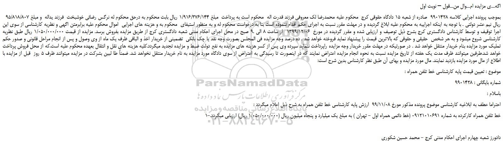 بموجب پرونده اجرایی کلاسه 9901428  صادره از شعبه 15 دادگاه حقوقی کرج  محکوم علیه محمدرضا لک معروفی فرزند قدرت اله  محکوم است به پرداخت  مبلغ 1/916/376/144 ریال بابت محکوم به درحق محکوم له نرگس رضائی خوشبخت  فرزند یداله  و مبلغ 95/818/807 ریال نیم عشر دولتی . با توجه به اینکه اجراییه به محکوم علیه ابلاغ گردیده و در مهلت مقرر نسبت به اجرای حکم اقدام ننموده است بنا به درخواست محکوم له و به منظور استیفای  محکوم به و هزینه های اجرایی  اموال محکوم علیه برابرمتن اگهی و نظریه کارشناسی از سوی این اجرا توقیف و توسط کارشناس دادگستری کرج بشرح ذیل توصیف و ارزیابی شده و مقرر گردیده در مورخ  1399/12/06  از ساعت 8 الی .9 صبح در محل اجرای احکام مدنی شعبه دادگستری کرج از طریق مزایده بفروش برسد. مزایده از قیمت 1/050/000/000 ریال طبق نظریه کارشناسی شروع میشود و به هر شخص  حقیقی و حقوقی که بالاترین قیمت را پیشنهاد نماید فروخته خواهد شد . ده درصد وجه مزایده فی المجلس بصورت وجه نقد یا چک بانکی  تضمینی از خریدار اخذ و الباقی ظرف یک ماه از وی وصول و پس از انجام مراحل قانونی و صدور حکم تملیک مورد مزایده بنام خریدار منتقل خواهد شد . در صورتیکه در مهلت مقرر خریدار وجه مزایده راپرداخت ننماید سپرده وی پس از کسر هزینه های مزایده به نفع دولت ضبط و مزایده تجدید میگردد.کلیه هزینه های نقل و انتقال بعهده محکوم علیه است.که از محل فروش پرداخت خواهد شد.طرفین میتوانند ظرف مدت یک هفته از تاریخ مزایده نسبت به نحوه انجام مزایده اعتراض نمایند که در اینصورت تا رسیدگی به اعتراض از سوی دادگاه مورد مزایده به نام خریدار منتقل نخواهد شد. ضمناً طا لبین بشرکت در مزایده میتوانند ظرف 5 روز  قبل از مزایده با اطلاع از مال مورد مزایده بازدید نمایند. مال مورد مزایده و بهای آن طبق نظر کارشناس بدین شرح است: