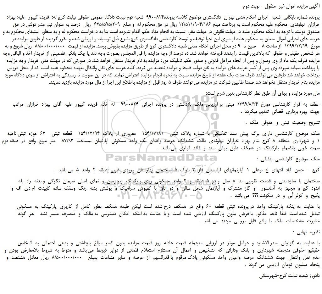 پرونده شماره بایگانی شعبه اجرای احکام مدنی تهران دادگستری موضوع کلاسه پرونده9900824 شعبه دوم نیابت دادگاه عمومی حقوقی نیابت کرج له: فریده کیپور علیه: بهزاد خرازان نهاوندی محکوم علیه محکوم است به پرداخت مبلغ 12/511/904/186 ریال در حق محکوم له و مبلغ 625/595/209 ریال درصد به عنوان نیم عشر دولتی در حق صندوق دولت. با توجه به اینکه محکوم علیه در مهلت قانونی در مهلت مقرر نسبت به انجام مفاد حکم اقدام ننموده است بنا به درخواست محکوم له و به منظور استیفای محکوم به و هزینه های اجرایی اموال متعلق به محکوم علیه از سوی این اجرا توقیف و توسط کارشناسی دادگستری کرج بشرح ذیل توصیف و ارزیابی شده و مقرر گردیده از طریق مزایده در مورخ 1399/12/19 از ساعت 8 صبح تا 9 در محل اجرای احکام مدنی شعبه دادگستری کرج از طریق مزایده بفروش برسد. مزایده از قیمت 8/500/000/000 ریال شروع و به هر شخص حقیقی و حقوقی که بالاترین قیمت را بدهد فروخته خواهد شد. ده درصد از وجه مزایده را فی المجلس بصورت وجه نقد یا چک بانکی تضمینی از خریدار اخذ و الباقی وجه مزایده ظرف یک ماه از وی وصول و پس از انجام مراحل قانونی و صدور حکم تملیک مورد مزایده به نام خریدار منتقل خواهد شد. در صورتی که در مهلت مقرر خریدار وجه مزایده را پرداخت ننماید سپرده وی پس از کسر هزینه های مزایده به نفع دولت ضبط و مزایده تجدید می گردد. کلیه هزینه های نقل وانتقال بعهده محکوم علیه است که از محل فروش پرداخت خواهد شد طرفین می توانند ظرف مدت یک هفته از تاریخ مزایده نسبت به نحوه انجام مزایده اعتراض نمایند که در این صورت تا رسیدگی به اعتراض از سوی دادگاه مورد مزایده بنام خریدار منتقل نخواهد شد ضمنا طالبین شرکت در مزایده می توانند ظرف 5 روز قبل از مزایده بااطلاع این اجرا از مال مورد مزایده بازدید نمایند.