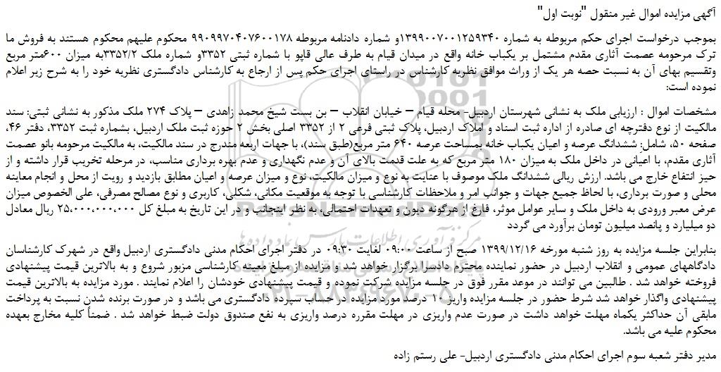 "آگهی مزایده اموال غیر منقول "نوبت اول