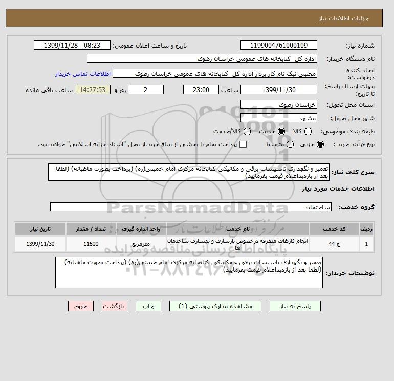 شرح کلی نیاز: تعمیر و نگهداری تاسیسات برقی و مکانیکی کتابخانه مرکزی امام خمینی(ره) (پرداخت بصورت ماهیانه) (لطفا بعد از بازدیداعلام قیمت بفرمایید)