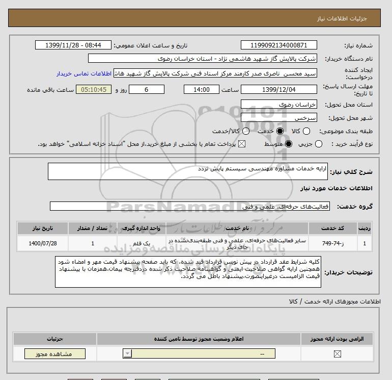 نام دستگاه خریدار:شرکت پالایش گاز شهید هاشمی نژاد - استان خراسان رضوی