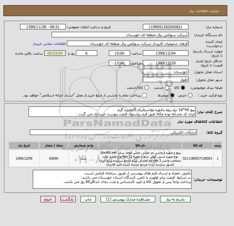 شرح کلی نیاز: پیچ 40*16 نیم رزوه بامهره وواشرفنری گالوانیزه گرم
