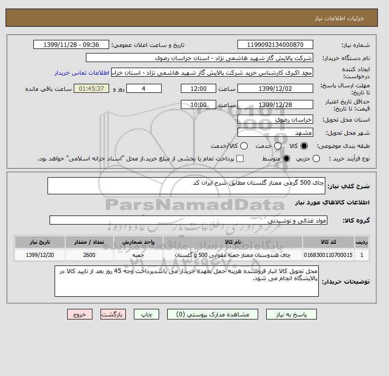 نام دستگاه خریدار:شرکت پالایش گاز شهید هاشمی نژاد - استان خراسان رضوی