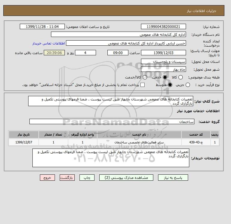 توضیحات خریدار:تعمیرات کتابخانه های عمومی شهرستان چابهار طبق لیست پیوست . ضمنا فرمهای پیوستی تکمیل و بارگزاری گردد