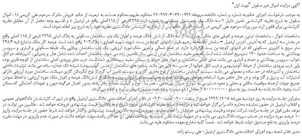 به موجب درخواست اجرای حکم به شماره و شماره دادنامه مربوطه 9909970407700799 محکوم علیهم محکوم هستند به تبعیت از حکم  فروش ماترک مرحوم علی کریمی (1- اموال منقول به شرح نظریه کارشناسی تامین دلیل 2-سه دانگ یک باب منزل مسکونی به شماره ثبت 2295فرعی از 115اصلی واقع در اردبیل ) و تقسیم وجه حاصل از آن مطابق نظریه کارشناسی برابر قانون ارث بین وراث مرحوم علی کریمی در راستای اجرای حکم پس از ارجاع به کارشناس دادگستری نظریه خود را به شرح زیر اعلام نموده است: