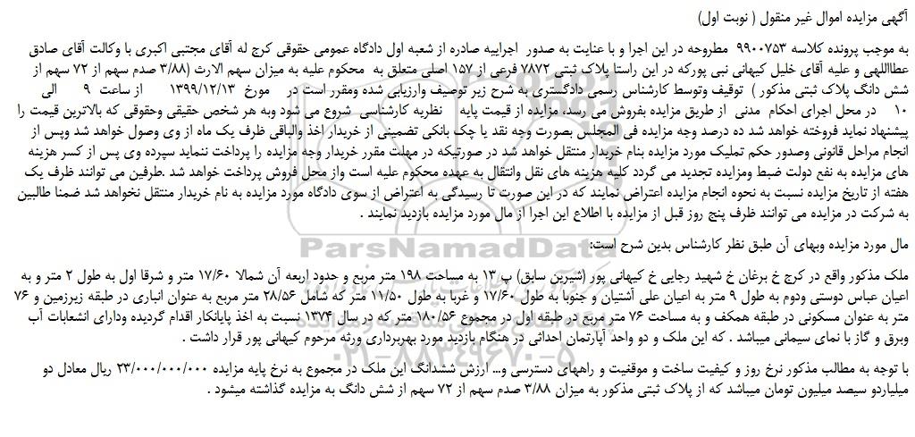 به موجب پرونده کلاسه 9900753 مطروحه در این اجرا و با عنایت به صدور اجراییه صادره از شعبه اول دادگاه عمومی حقوقی کرج له آقای مجتبی اکبری با وکالت آقای صادق عطااللهی و علیه آقای خلیل کیهانی نبی پورکه در این راستا پلاک ثبتی 7872 فرعی از 157 اصلی متعلق به محکوم علیه به میزان سهم الارث (3/88 صدم سهم از 72 سهم از شش دانگ پلاک ثبتی مذکور ) توقیف وتوسط کارشناس رسمی دادگستری به شرح زیر توصیف وارزیابی شده ومقرر است در مورخ 1399/12/13 از ساعت 9 الی 10 در محل اجرای احکام مدنی از طریق مزایده بفروش می رسد، مزایده از قیمت پایه نظریه کارشناسی شروع می شود وبه هر شخص حقیقی وحقوقی که بالاترین قیمت را پیشنهاد نماید فروخته خواهد شد ده درصد وجه مزایده فی المجلس بصورت وجه نقد یا چک بانکی تضمینی از خریدار اخذ والباقی ظرف یک ماه از وی وصول خواهد شد وپس از انجام مراحل قانونی وصدور حکم تملیک مورد مزایده بنام خریدار منتقل خواهد شد در صورتیکه در مهلت مقرر خریدار وجه مزایده را پرداخت ننماید سپرده وی پس از کسر هزینه های مزایده به نفع دولت ضبط ومزایده تجدید می گردد کلیه هزینه های نقل وانتقال به عهده محکوم علیه است واز محل فروش پرداخت خواهد شد .طرفین می توانند ظرف یک هفته از تاریخ مزایده نسبت به نحوه انجام مزایده اعتراض نمایند که در این صورت تا رسیدگی به اعتراض از سوی دادگاه مورد مزایده به نام خریدار منتقل نخواهد شد ضمنا طالبین به شرکت در مزایده می توانند ظرف پنج روز قبل از مزایده با اطلاع این اجرا از مال مورد مزایده بازدید نمایند .