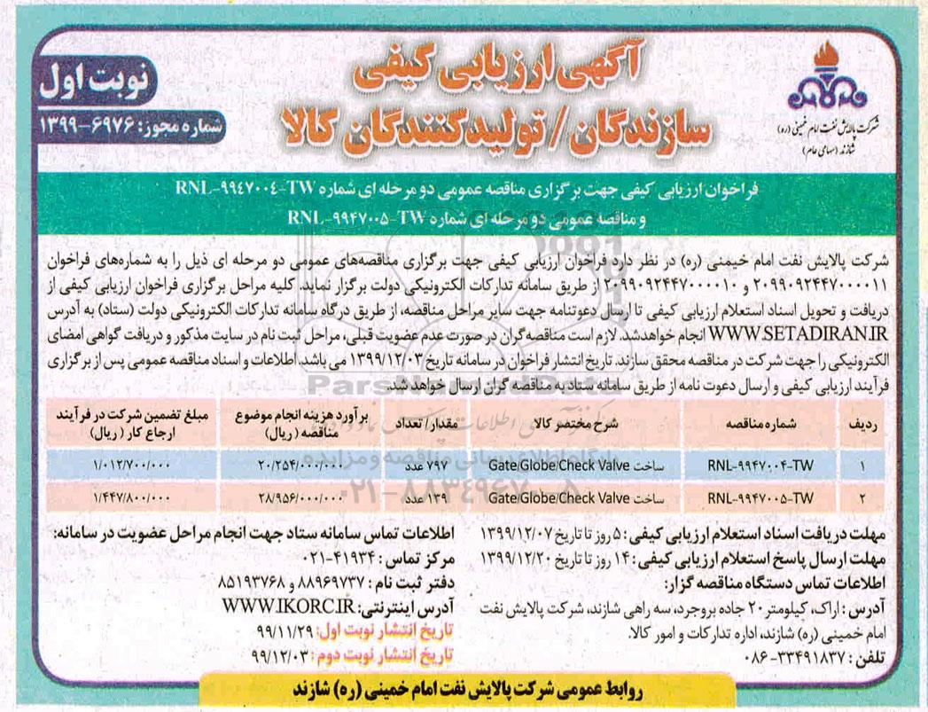 RNL-9947004-TW ساخت GATE/GLOBE/CHECK VALVE  797 عدد 20.254.000.000 1.012.700.000