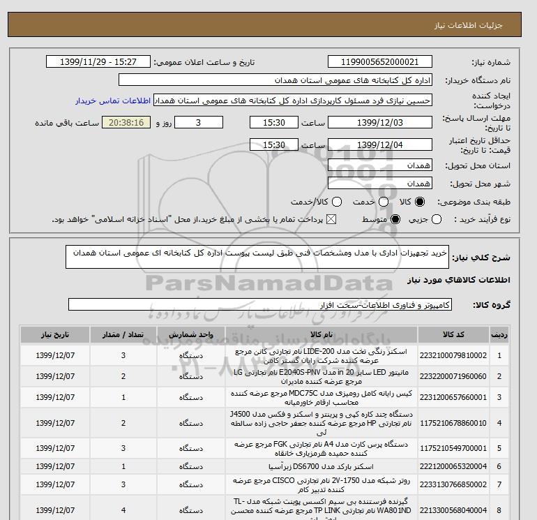 شرح کلی نیاز: خرید تجهیزات اداری با مدل ومشخصات فنی طبق لیست پیوست اداره کل کتابخانه ای عمومی استان همدان