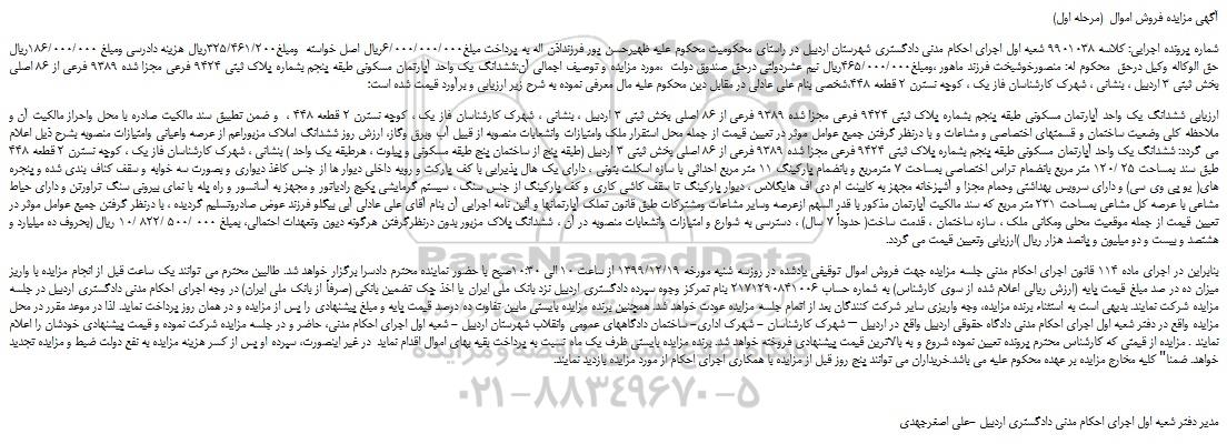 شماره پرونده اجرایی: کلاسه 9901038 شعبه اول اجرای احکام مدنی دادگستری شهرستان اردبیل در راستای محکومیت محکوم علیه ظهیرحسن پور فرزنداذن اله به پرداخت مبلغ6/000/000/000ریال اصل خواسته  ومبلغ325/461/200ریال هزینه دادرسی ومبلغ 186/000/000ریال حق الوکاله وکیل درحق  محکوم له: منصورخوشبخت فرزند ماهور ،ومبلغ465/000/000ریال نیم عشردولتی درحق صندوق دولت  ،مورد مزایده و توصیف اجمالی آن:ششدانگ یک واحد آپارتمان مسکونی طبقه پنجم بشماره پلاک ثبتی 9424 فرعی مجزا شده 9389 فرعی از 86 اصلی بخش ثبتی 3 اردبیل ، بنشانی ، شهرک کارشناسان فاز یک ، کوچه نسترن 2 قطعه 448،شخصی بنام علی عادلی در مقابل دین محکوم علیه مال معرفی نموده به شرح زیر ارزیابی و برآورد قیمت شده است؛