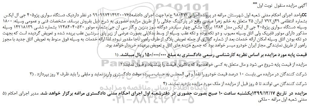 واحد اجرای احکام مدنی شعبه اول شهرستان مراغه در پرونده اجرایی980472 ج/م1جهت اجرای دادنامه9909974149300765 در نظر داردیک دستگاه سواری پژو405 جی ال ایکس cc 1800 بشماره انتظامی 49ق792 ایران 35 متعلق به خانم زهرا عباسی واقع در پارکینگ جلالی را از طریق مزایده حضوری به شرح ذیل بفروش برساند. مشخصات فنی و عمومی وسیله: وسیله دستگاه سواری پژو405 جی ال ایکس مدل 1384 برنگ مشکی چهار سیلندر دوگانه سوز بنزین و گاز سی ان جی بشماره موتور 12484040530 بشماره شاسی 14218139 وسیله مذکور دارای موتور فابریک ولی اتاق وسیله معیوب و دو تکه بوده و تکه عقب وسیله از وسط بدلایلی بصورت عرضی از زیر پای سرنشین عقب بریده شده و تعویض گردیده است که بجهت دو تکه بودن اتاق وسیله امکان ارائه خدمات بعد از شماره گذاری از جمله تعویض پلاک از طرف راهور ناجا مقدور نبوده لذا ارائه خدمات به وسیله فوق منوط به تعویض اتاق جدید با مجوز راهور از طریق نمایندگی مجاز ایران خودرو میسر خواهد بود که جمیع هزینه های اتاق و تعویض برعهده خریدار خواهد بود.