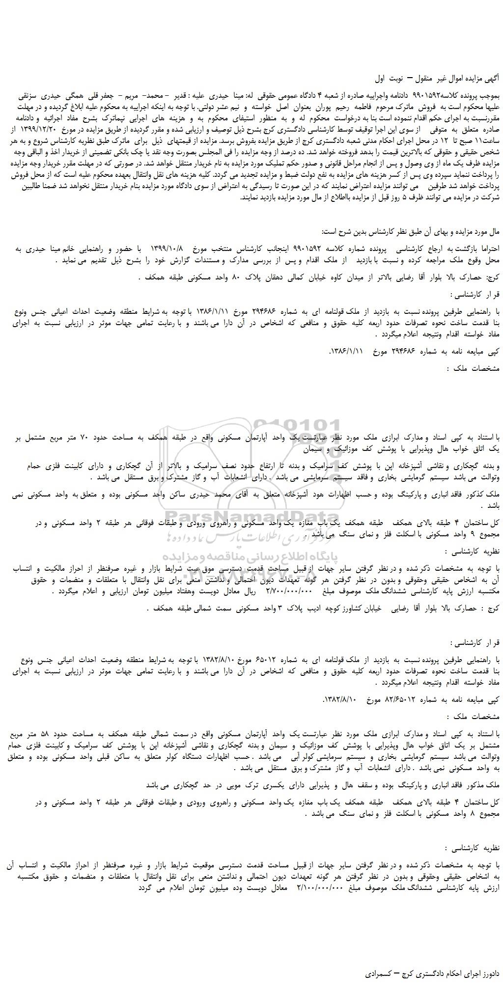 بموجب پرونده کلاسه9901592 دادنامه واجراییه صادره از شعبه 4 دادگاه عمومی حقوقی له: مینا حیدری علیه : قدیر - محمد- مریم - جعفر قلی همگی حیدری سزنقی علیها محکوم است به فروش ماترک مرحوم فاطمه رحیم پوران بعنوان اصل خواسته و نیم عشر دولتی. با توجه به اینکه اجراییه به محکوم علیه ابلاغ گردیده و در مهلت مقررنسبت به اجرای حکم اقدام ننموده است بنا به درخواست محکوم له و به منظور استیفای محکوم به و هزینه های اجرایی نپماترک بشرح مفاد اجرائیه و دادنامه صادره متعلق به متوفی از سوی این اجرا توقیف توسط کارشناسی دادگستری کرج بشرح ذیل توصیف و ارزیابی شده و مقرر گردیده از طریق مزایده در مورخ 1399/12/20 از ساعت11 صبح تا 12 در محل اجرای احکام مدنی شعبه دادگستری کرج از طریق مزایده بفروش برسد. مزایده از قیمتهای ذیل برای ماترک طبق نظریه کارشناس شروع و به هر شخص حقیقی و حقوقی که بالاترین قیمت را بدهد فروخته خواهد شد. ده درصد از وجه مزایده را فی المجلس بصورت وجه نقد یا چک بانکی تضمینی از خریدار اخذ و الباقی وجه مزایده ظرف یک ماه از وی وصول و پس از انجام مراحل قانونی و صدور حکم تملیک مورد مزایده به نام خریدار منتقل خواهد شد. در صورتی که در مهلت مقرر خریدار وجه مزایده را پرداخت ننماید سپرده وی پس از کسر هزینه های مزایده به نفع دولت ضبط و مزایده تجدید می گردد. کلیه هزینه های نقل وانتقال بعهده محکوم علیه است که از محل فروش پرداخت خواهد شد طرفین می توانند مزایده اعتراض نمایند که در این صورت تا رسیدگی به اعتراض از سوی دادگاه مورد مزایده بنام خریدار منتقل نخواهد شد ضمنا طالبین شرکت در مزایده می توانند ظرف 5 روز قبل از مزایده بااطلاع از مال مورد مزایده بازدید نمایند.