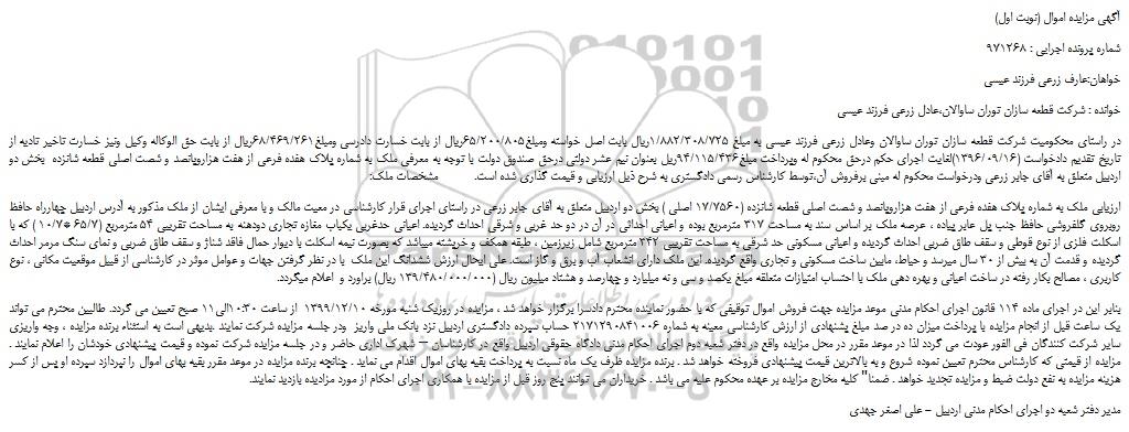 در راستای محکومیت شرکت قطعه سازان توران ساوالان وعادل زرعی فرزند عیسی به مبلغ 1/882/308/725ریال بابت اصل خواسته ومبلغ65/200/805ریال از بابت خسارت دادرسی ومبلغ68/469/261ریال از بابت حق الوکاله وکیل ونیز خسارت تاخیر تادیه از تاریخ تقدیم دادخواست (1396/09/16)لغایت اجرای حکم درحق محکوم له وپرداخت مبلغ94/115/436ریل بعنوان نیم عشر دولتی درحق صندوق دولت با توجه به معرفی ملک به شماره پلاک هفده فرعی از هفت هزاروپانصد و شصت اصلی قطعه شانزده بخش دو اردبیل متعلق به آقای جابر زرعی ودرخواست محکوم له مبنی برفروش آن،توسط کارشناس رسمی دادگستری به شرح ذیل ارزیابی و قیمت گذاری شده است. مشخصات ملک: