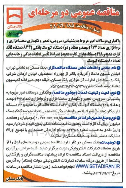 واگذاری دو سالانه امور مربوط به پشتیبانی ، سرویس ، تعمیر و نگهداری سخت افزاری و نرم افزاری تعداد 972 دستگاه کیوسک بانکی (844 دستگاه فاقد کارت هدیه و 128 دستگاه دارای کارت هدیه همراه با تامین قطعات یدکی و جابجایی تعداد 80 دستگاه کیوسک