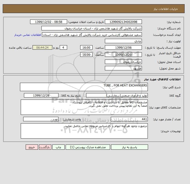 نام دستگاه خریدار:شرکت پالایش گاز شهید هاشمی نژاد - استان خراسان رضوی