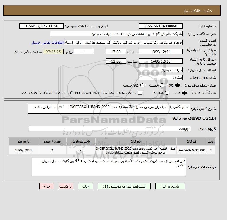 | 1 | 5642260916320001 | کلگی قطعه آچار بکس بادی مدل INGERSSOLL RAND 2920 مرجع عرضه کننده رهجو صنعت سناباد شرق | عدد | 2 | 1399/12/16 |