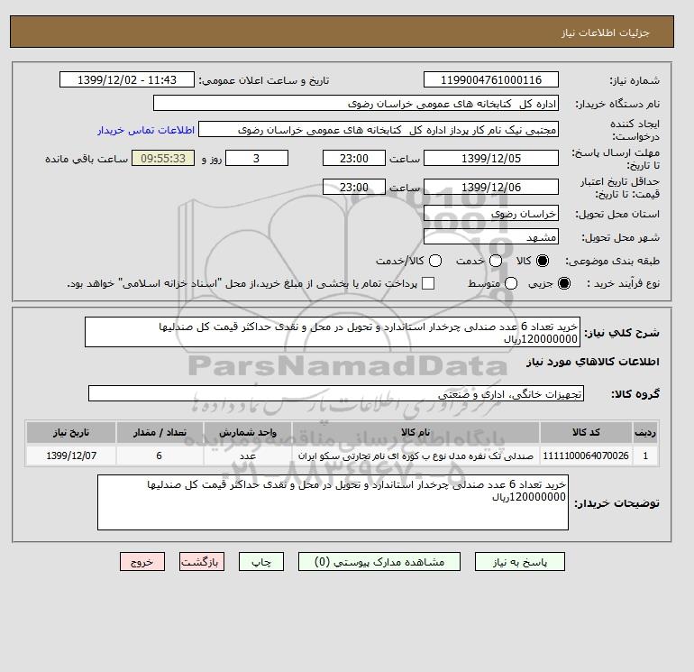 شرح کلی نیاز: خرید تعداد 6 عدد صندلی چرخدار استاندارد و تحویل در محل و نقدی حداکثر قیمت کل صندلیها 120000000ریال