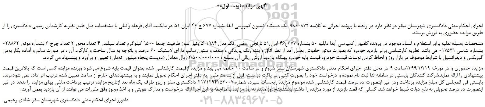اجرای احکام مدنی دادگستری شهرستان سقز در نظر دارد در رابطه با پرونده اجرائی به کلاسه 9900872 یک دستگاه کامیون کمپرسی آیفا بشماره 677 ع 46 ایران 51 در مالکیت آقای فرهاد وکیلی با مشخصات ذیل طبق نظریه کارشناس رسمی دادگستری را از طریق مزایده حضوری به فروش برساند.